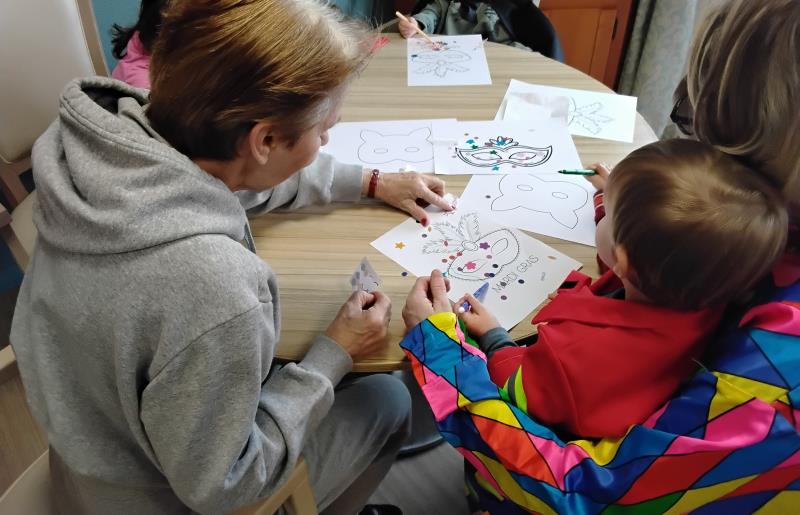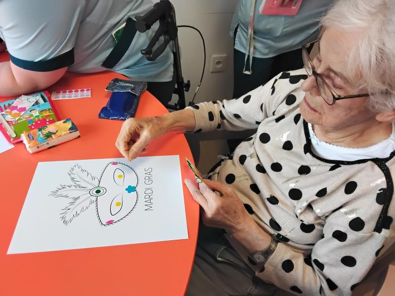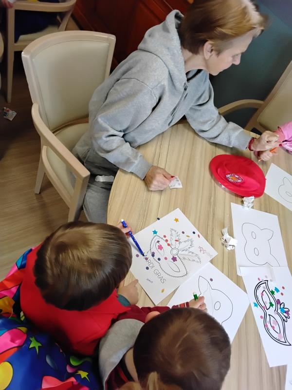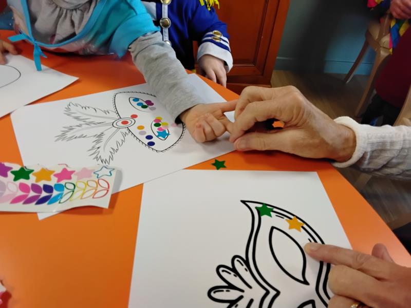 En ce jour de mardi gras, les enfants de la MAM de Trémuson "les copains d'abord " sont venus déguisés rendre visite aux résidents du Village de Bréhat de la résidence médicalisée La Tourelle d'Argent de Trémuson. Au cours de cette rencontre, résidents et enfants ont créé des masques pour décorer la salle commune.